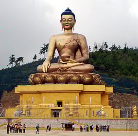 In a compound in a clearing on a hill, about ten minutes drive out of Thimphu, sits a newly-built and imposing statue of the Buddha. Though sealed off at night the spot still attracts cars packed with youngsters once the revelry in town gets over; the view down over the scattered lights of the valley is spectacular and there are no neighbours to complain about the noise. The Buddha Dordenma is 51.5 metres tall, made of gold and bronze, and filled with over 125,000 miniature replicas. Despite the universal Buddhist aspirations, the statue is primarily a domestic symbol, embodying both Bhutan's image as a spiritual idyll and its own aspirations to serving as the ground for better ways of living and governing.