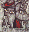 The face of a woman and the profile of a chiru, the endangered Tibetan antelope, gaze out in wrapt curiosity from this painting by artist Ang Sang. Against an overwhelmingly grey background, their wide eyes are strikingly bright and open. What are they watching that so holds their attention? The woman wears a Nike swoosh on her hat; and the chiru, that mascot of indigenous culture, sports a Playboy bunny. These logos, the bright red symbolism of which screams from the page like a noisy new entrant, seem to partake in their wearers' viewership. What is the relationship here? Woman and antelope fix their gaze on a common object. What they are watching must be truly beautiful, or truly repugnant, to so fascinate both human and beast. But the searing colour of the corporate logos has started to invade the whites of their eyes. This is part of a regular series of Himal's commentary on artwork by artists with the Lhasa-based Gedun Choephel Artists' Guild. Woodblock with brushwork, mineral pigments. 50 cm x 50 cm.