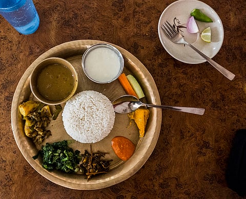 Does one live to eat, or eat to live? I guess in a country – indeed, a region – like ours, where so many must toil day in and day out just to be able to get by, the question may seem moot. But certain simple staples can be a culinary pleasure: these are the dishes that drive a powerful nostalgia when overseas, and that one does not tire of eating every day. Cuisine is varied according to community in Kathmandu, and Newari cuisine is obviously the most authentically 'Nepali', but for many of the valley's families, the menu for such a meal would read along the lines of: kalo daal (black lentils), bhuja (rice), kauli aloo (a dish of cauliflower and potatoes), saag (greens), tama aloo bodiko ras (a stew of bamboo shoots, potatoes and black-eyed peas), and golbhedako achar (tomato chutney). As the cherry on the top, one can drizzle a generous spoonful of ghiu (ghee) over the pile of rice. Of course, this thaali can be varied by substituting the tomato achar with potato alooko achar, but the kalo daal cannot be changed!