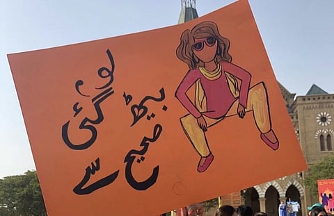 A placard at Aurat March 2019. The Urdu text reads, "Here you go: I am sitting correctly now". Photo: Facebook